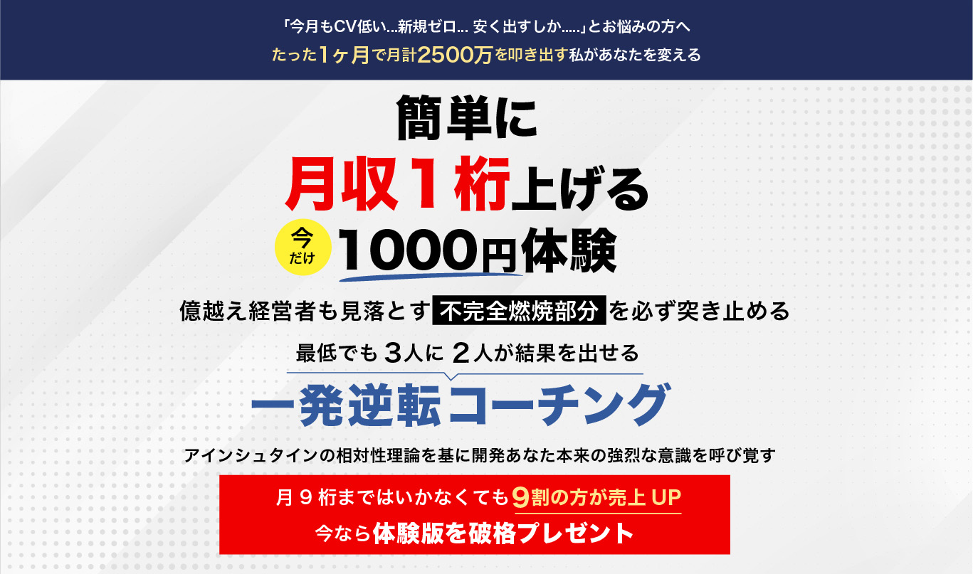 成功者と呼ばれる方からビジネス論を必死に学び、教わったセオリー通り工夫を試したところで何も変わらない。 その状況が歯痒い方は、このプログラムで一度別の分野から違った角度でリトライされる事を強くオススメします。