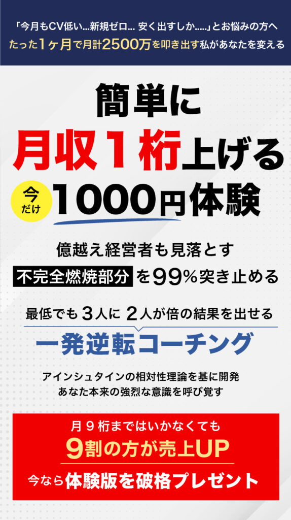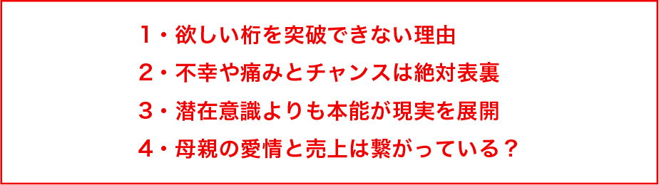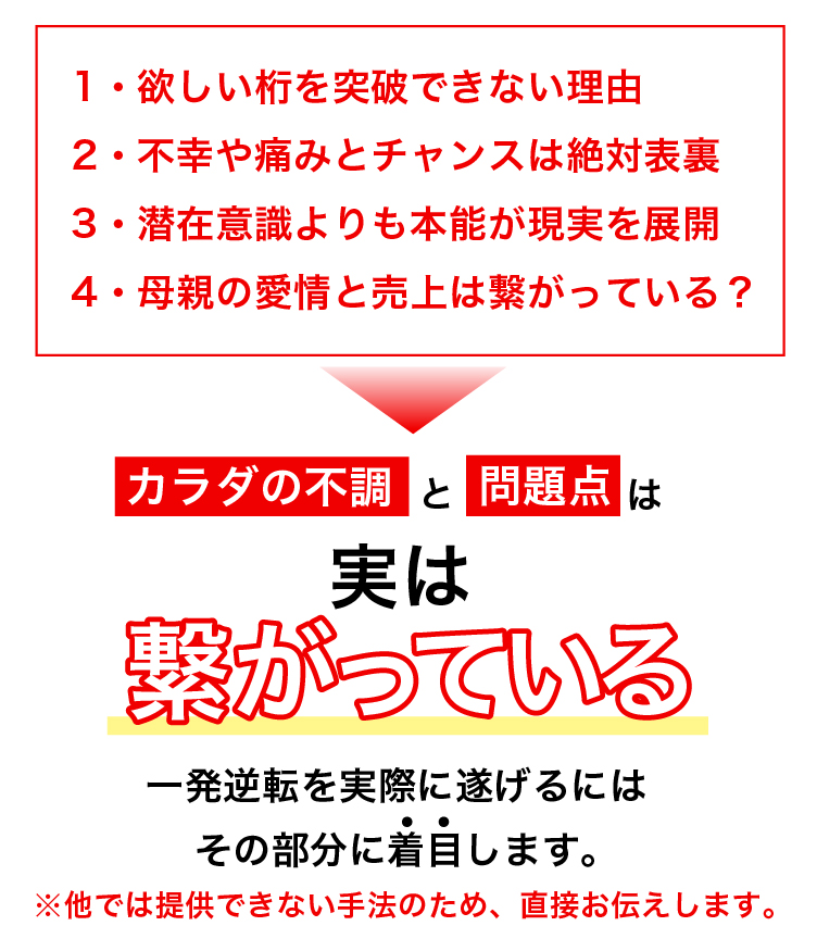 今のあなたがそんな深いサインに無頓着なまま、一向に何をしても売上が上がらない場合、素晴らしい2択目の思考、跳ね上がる3択目の思考に達していなく、今のあなたでは気付きに限界があり結果に繋がりにくい状況なのです。 成功者と呼ばれる方からビジネス論を必死に学び、教わったセオリー通り工夫を試したところで何も変わらない。 その状況が歯痒い方は、このプログラムで一度別の分野から違った角度でリトライされる事を強くオススメします。